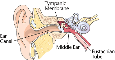 The tympanic membrane (eardrum) appears inflamed, reddened, and often protrudes outward. Usually, an ear infection begins after the eustachian tube (a small tube connecting the back of the nose to the middle ear space) has become swollen, congested, and closed, most commonly resulting from an ongoing viral respiratory infection.